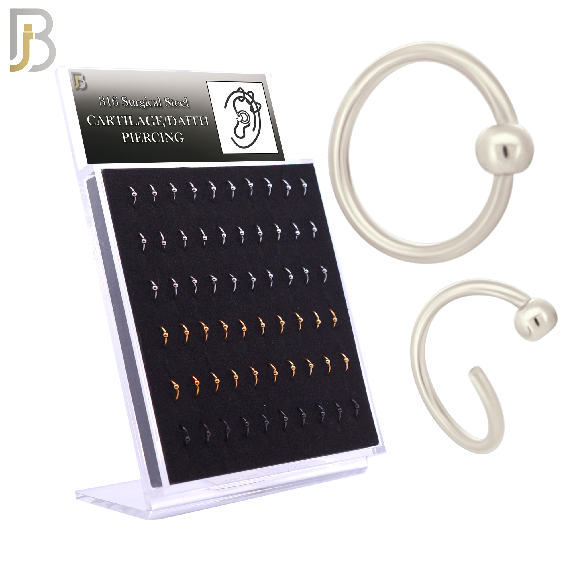 This 60-piece wholesale pack of 316L surgical steel fixed bead hoops offers a versatile selection of sizes, making them suitable for lip, ear, and nose piercings. Each hoop features a 2mm fixed bead, providing a secure and stylish accent while ensuring easy wear.