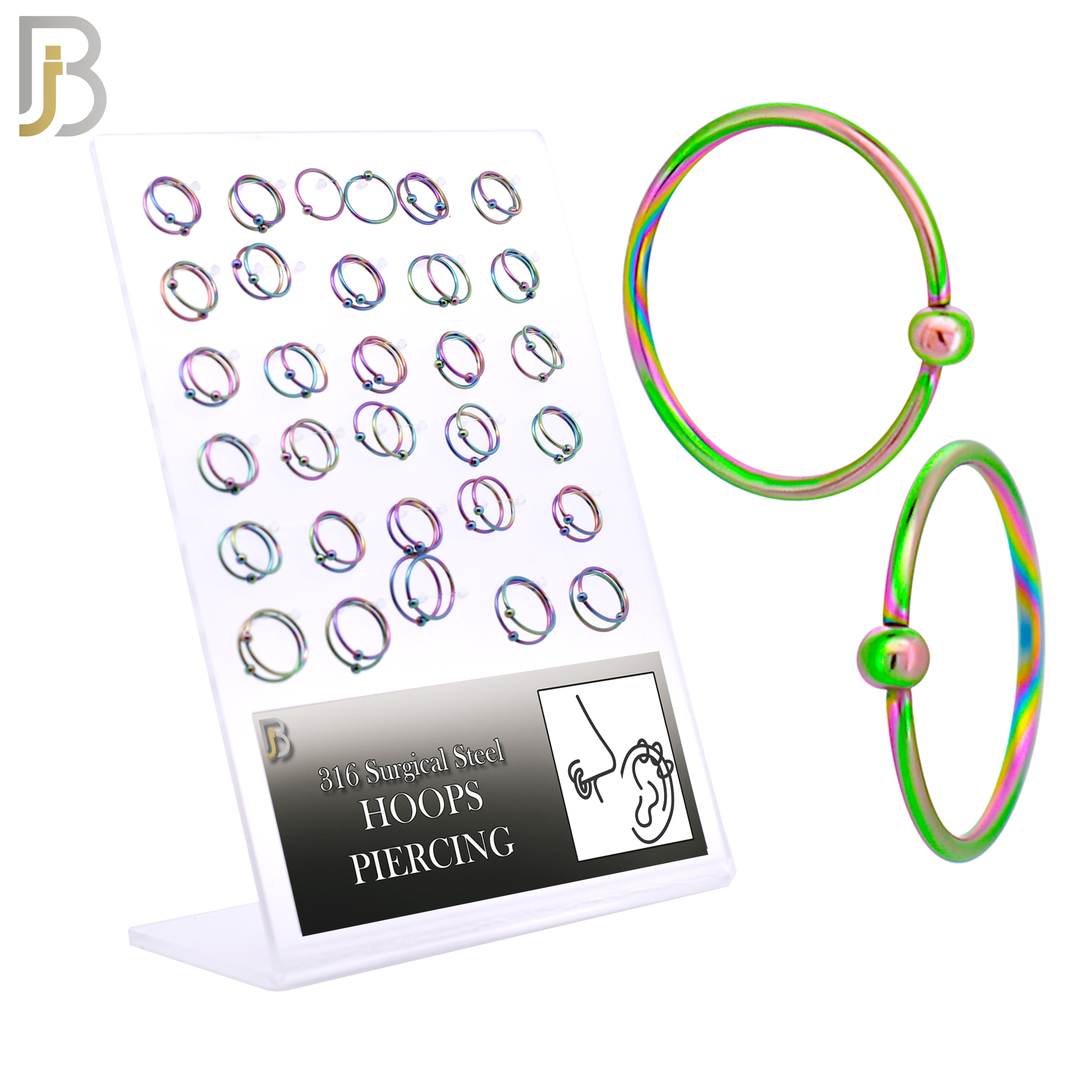 This 60-piece wholesale pack of 316L surgical steel fixed bead hoops offers a versatile selection of sizes, making them suitable for lip, ear, and nose piercings. Each hoop features a 2mm fixed bead, providing a secure and stylish accent while ensuring easy wear.
