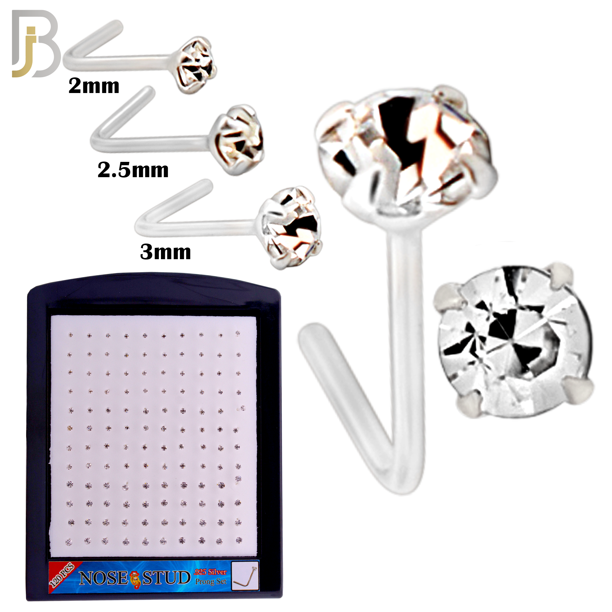 This 120-piece wholesale pack of 925 sterling silver L-shape nose studs features a classic prong-set design with sparkling clear zircon stones in three popular sizes: 2mm, 2.5mm, and 3mm. The variety of stone sizes allows customers to choose between a subtle shimmer or a bold sparkle, making this pack versatile and appealing to a wide range of preferences.